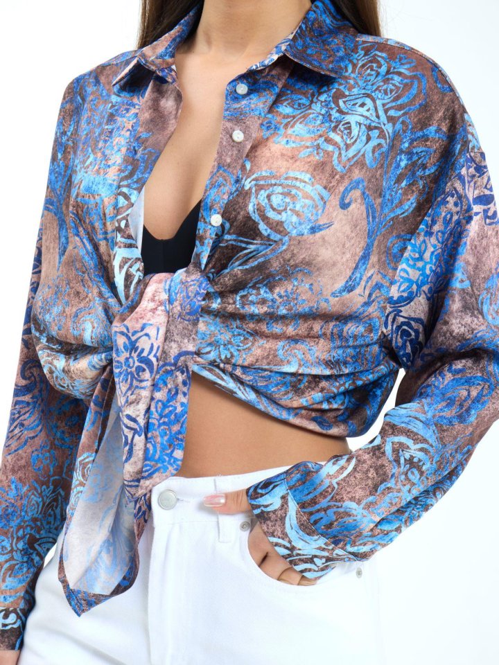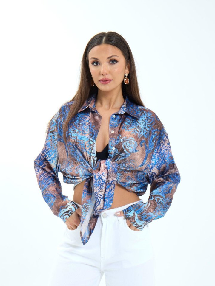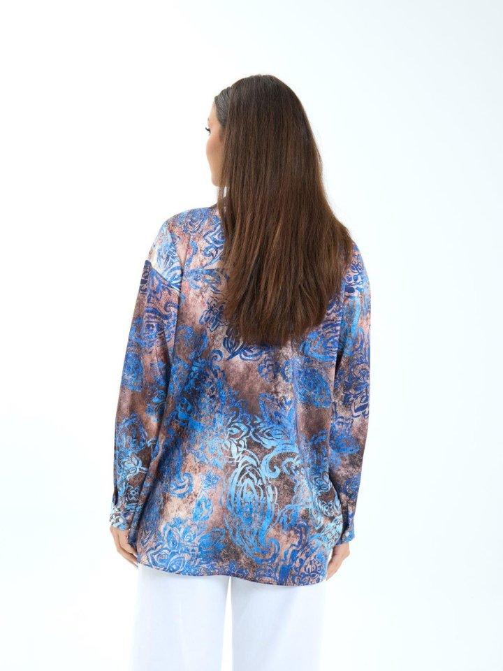 Kadın Uzun Kollu Yakadan Fermuarlı Kot Görünüm Desenli Uzun Modal Bluz