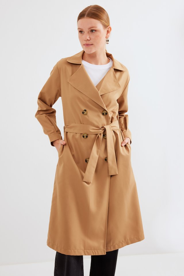 5853 Kruvaze Yaka Trençkot - Taba