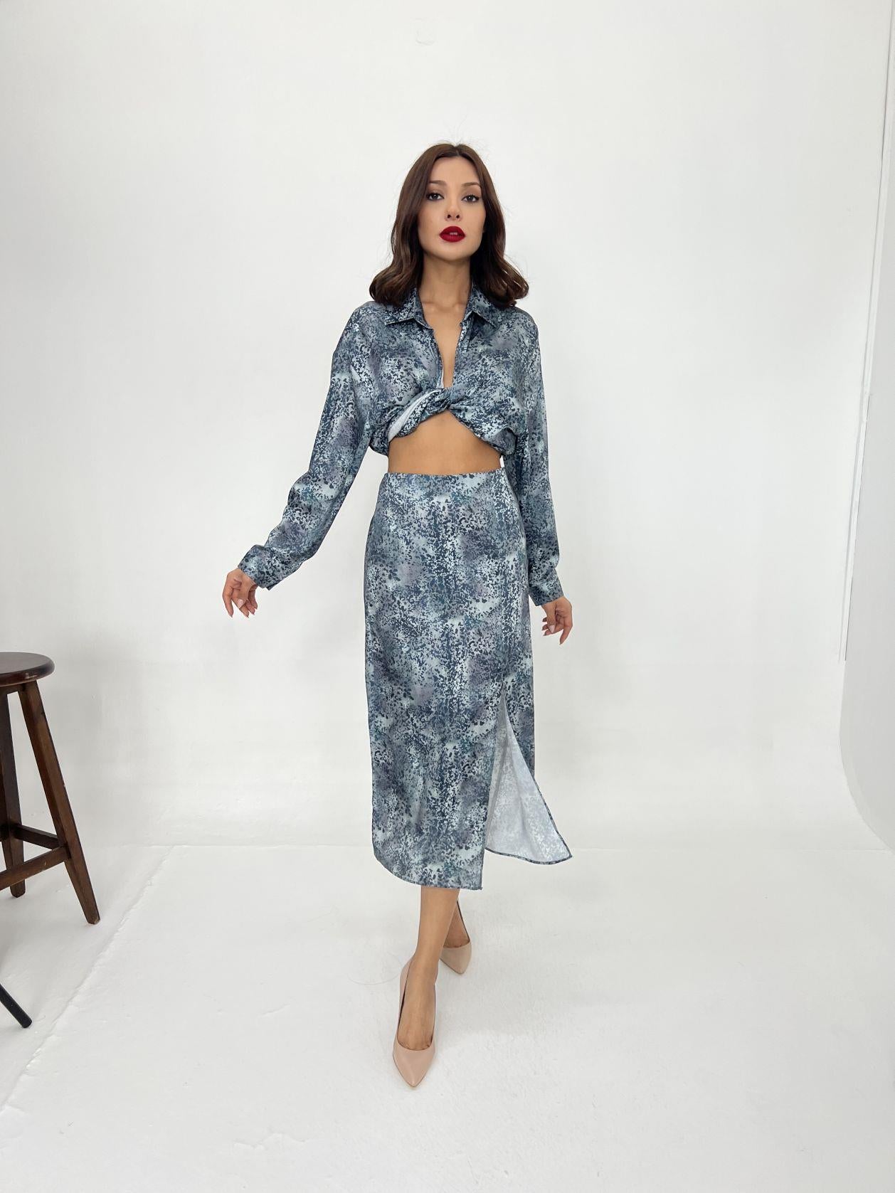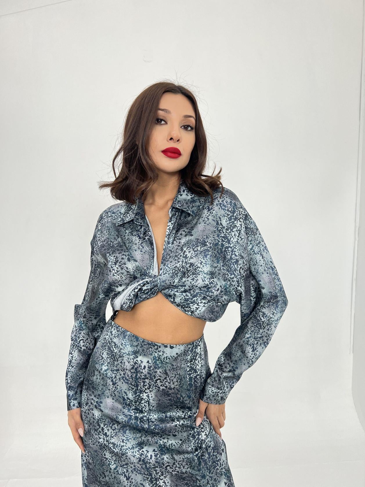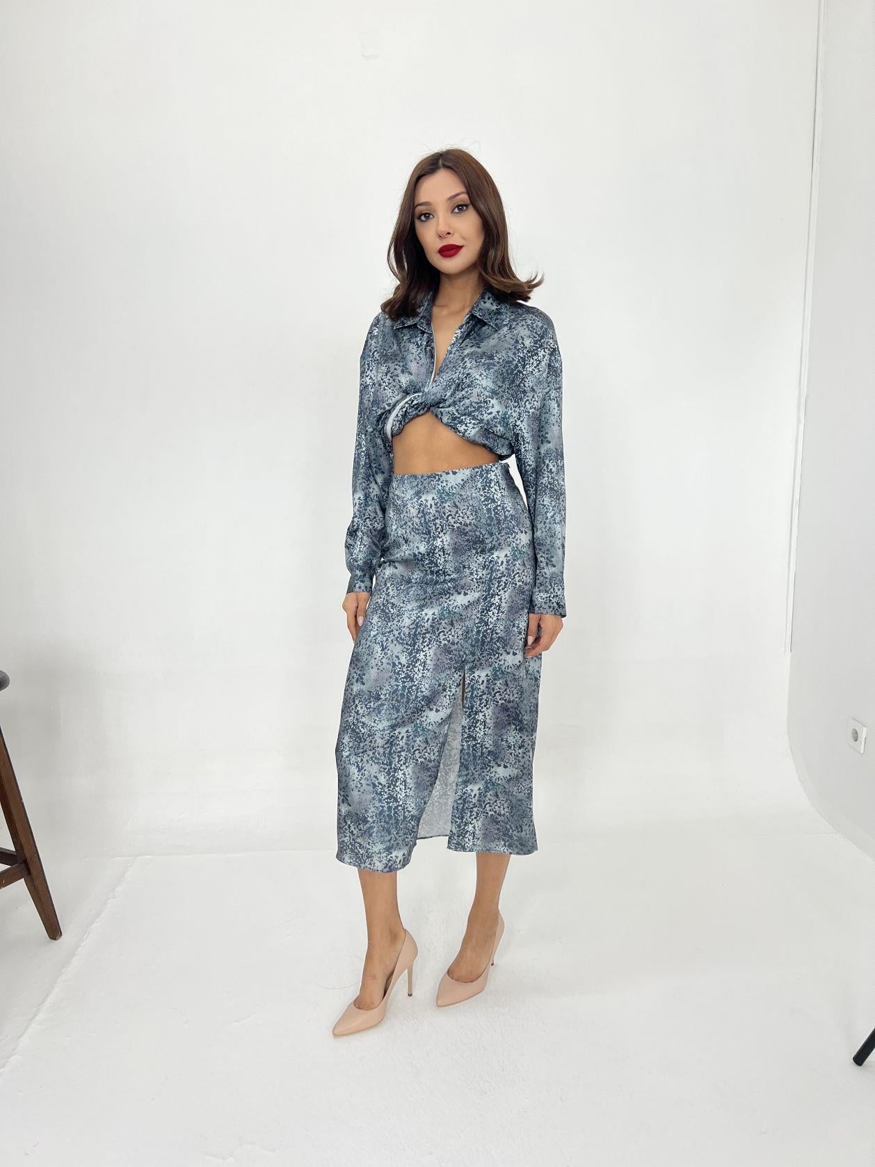 Kadın Uzun Kollu Yakadan Fermuarlı Kot Görünüm Desenli Uzun Modal Bluz