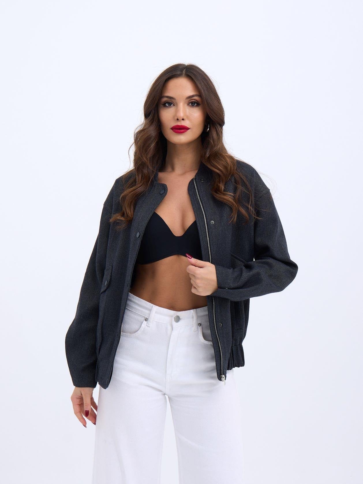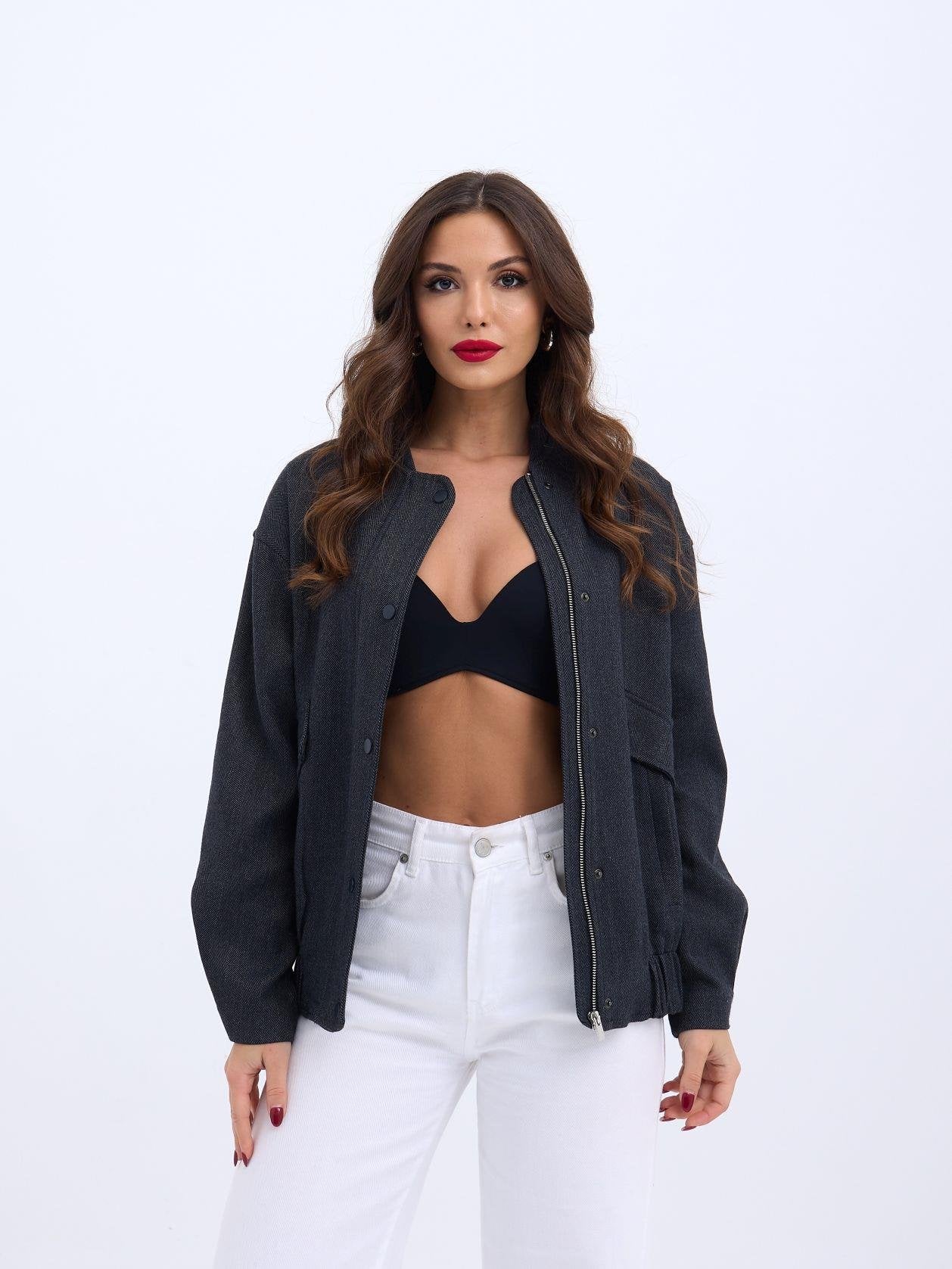 Kadın Uzun Kollu Yakadan Fermuarlı Kot Görünüm Desenli Uzun Modal Bluz