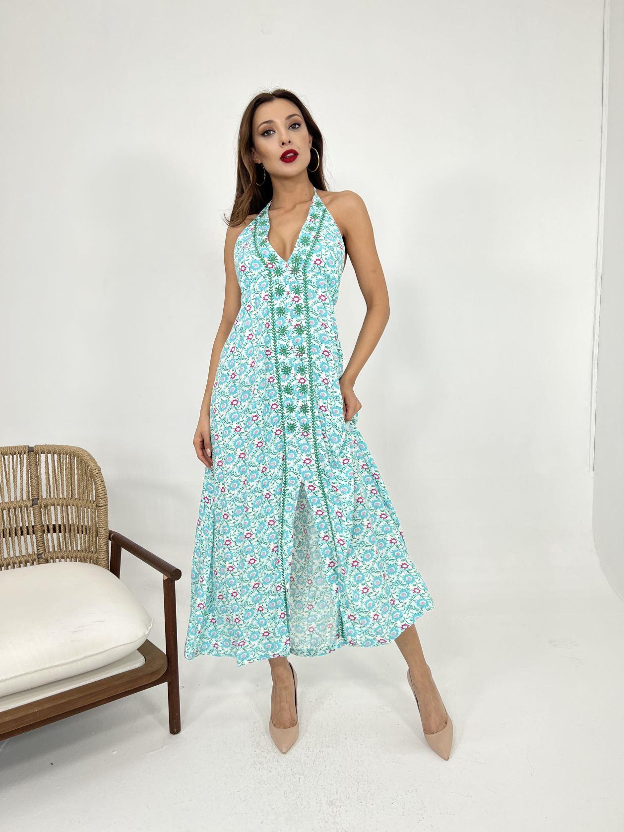 Kadın Askılı Degaje Yakalı Yırtmaçlı Kadife Midi Elbise