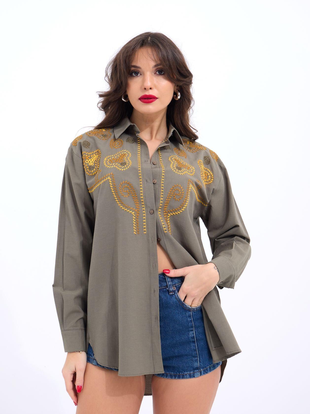 Kadın Uzun Kollu Yakadan Fermuarlı Kot Görünüm Desenli Uzun Modal Bluz