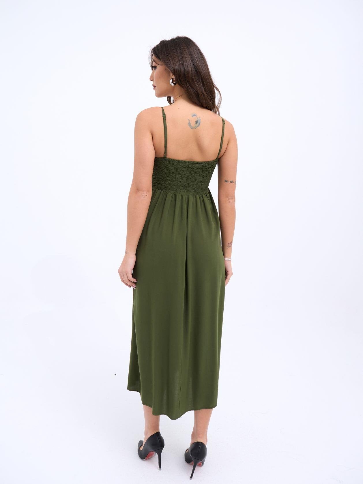 Kadın Askılı Degaje Yakalı Yırtmaçlı Kadife Midi Elbise
