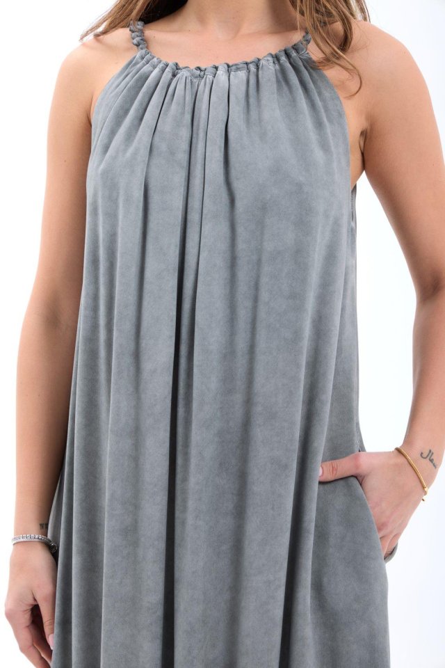 Kadın Askılı Degaje Yakalı Yırtmaçlı Kadife Midi Elbise