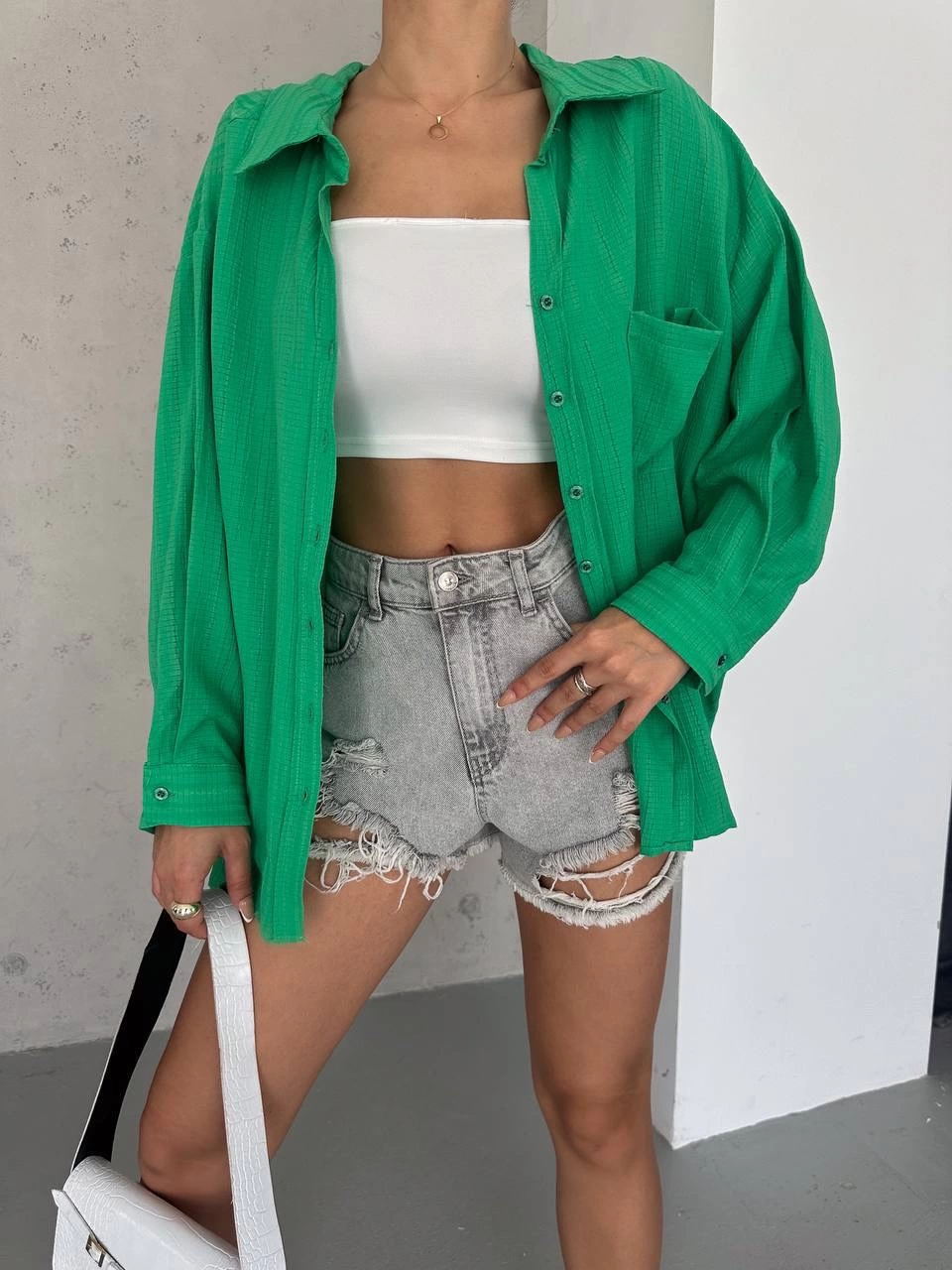 Ağaç Kabuğu Oversize Arkası Pileli Gömlek, rahat ve şık bir görünüm sunar.