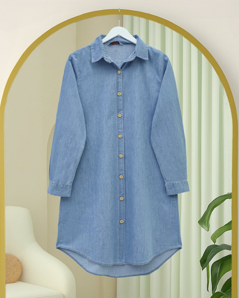 Ahşap Düğmeli Uzun Kot Tunik -Açık Mavi