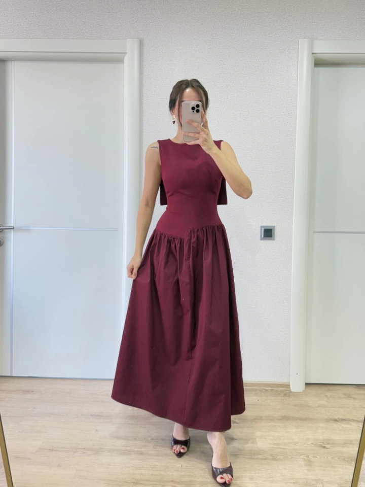 Arkası Kanatlı Uzun Elbise- Bordo