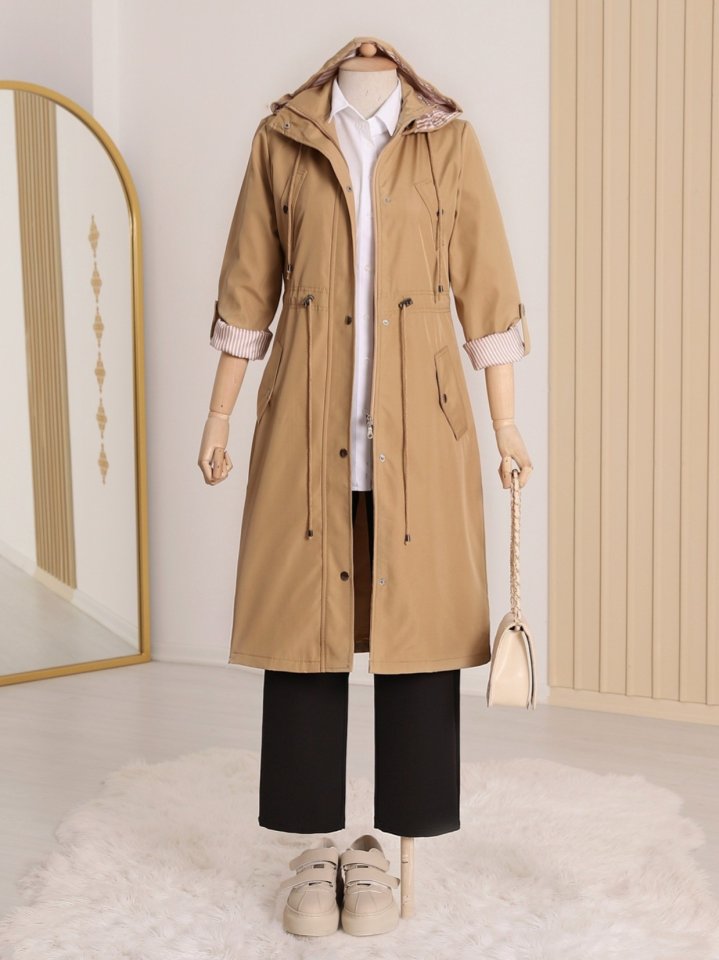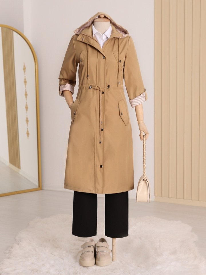 Astarı Çizgili Trençkot -Vizon