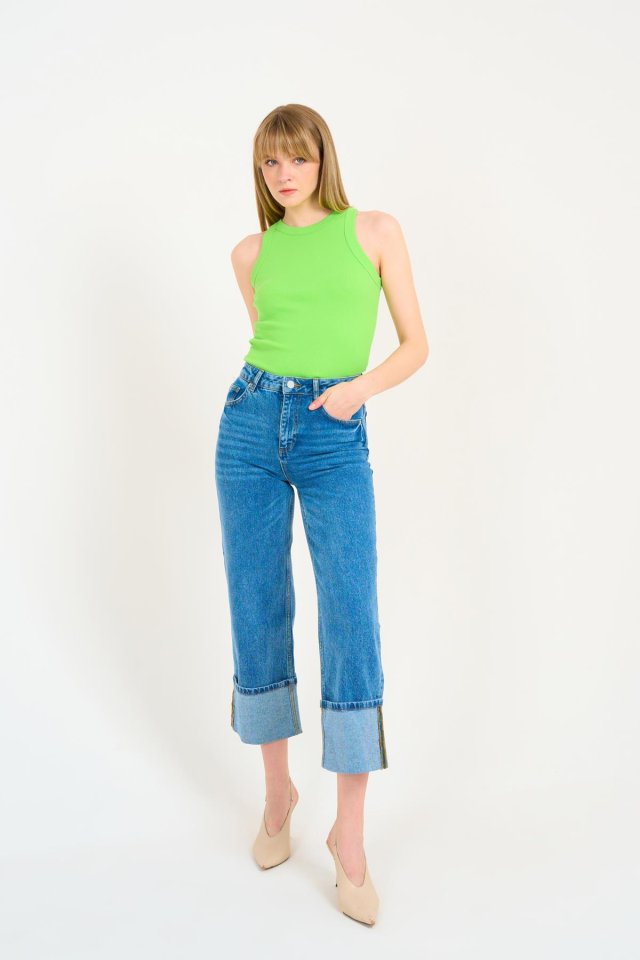 Kadın Uzun Kollu Yakadan Fermuarlı Kot Görünüm Desenli Uzun Modal Bluz