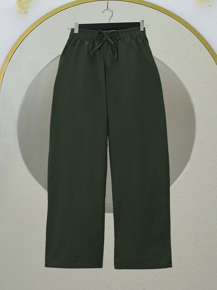 Bağcık Detaylı Bol Paça Beli Lastikli Keten Pantolon -Haki