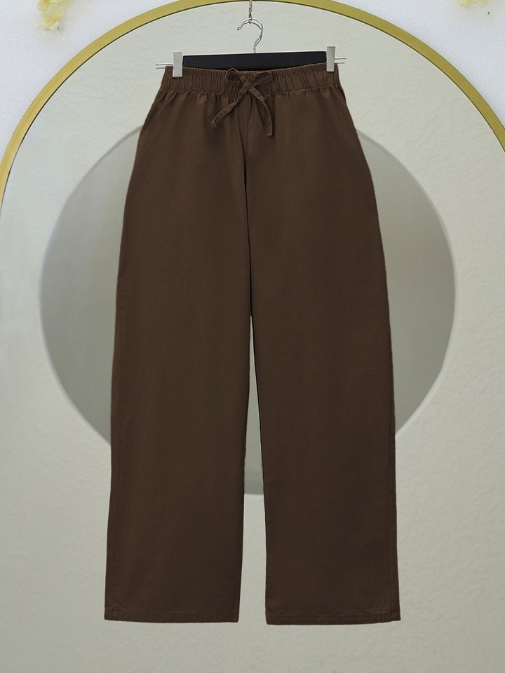Bağcık Detaylı Bol Paça Beli Lastikli Keten Pantolon -Kahve