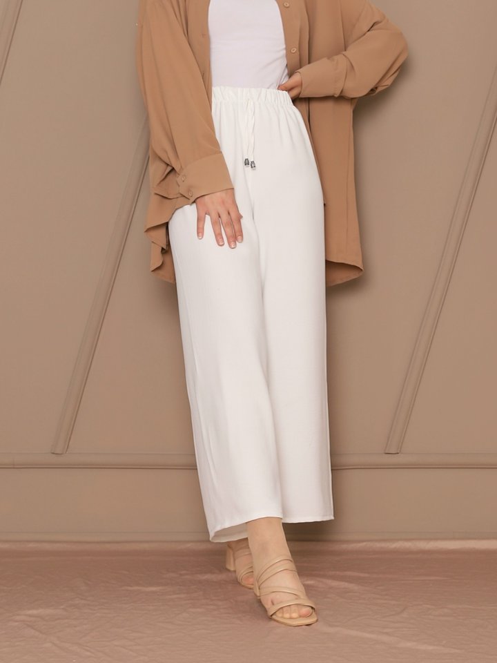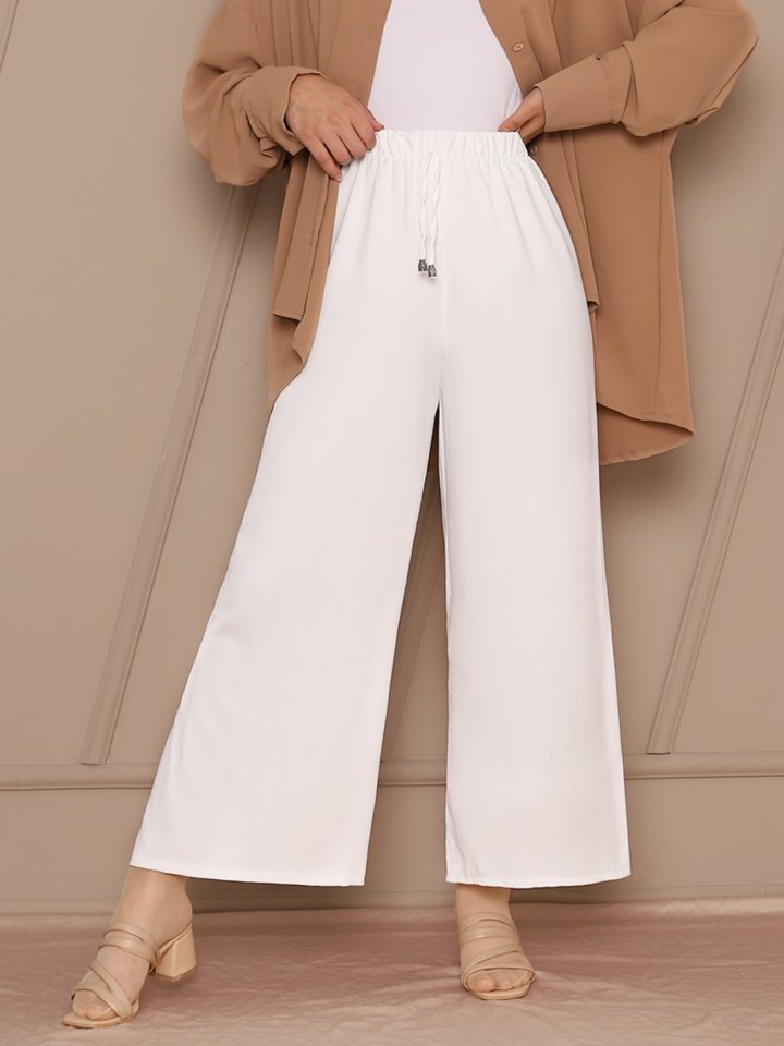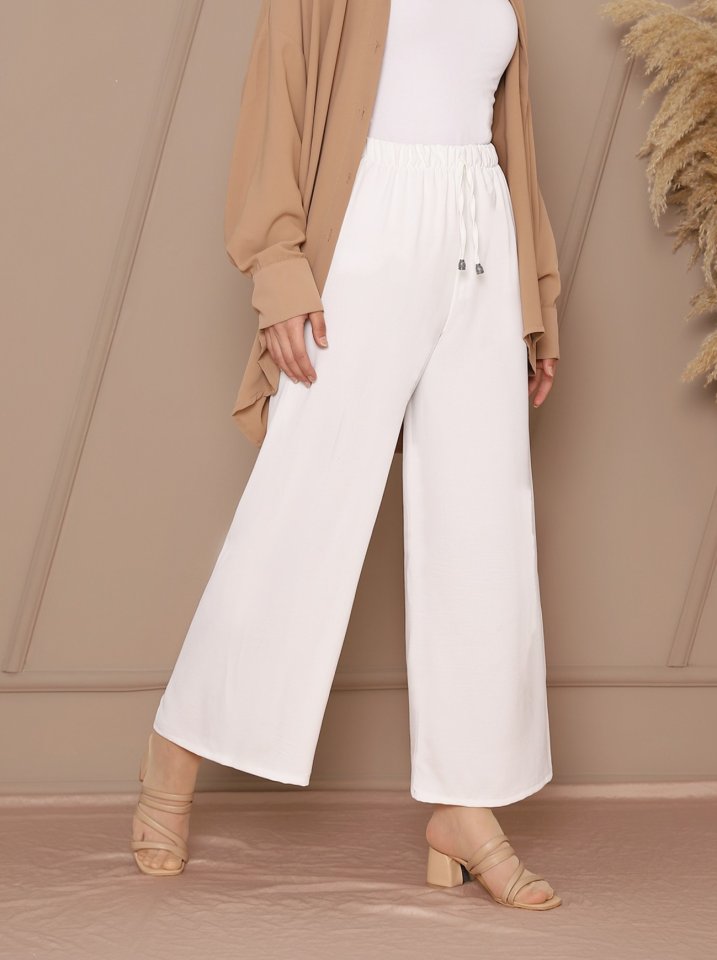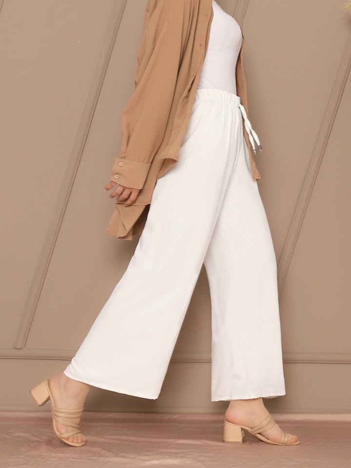 Bağcık Detaylı Bol Paça Beli Lastikli Pantolon -Beyaz