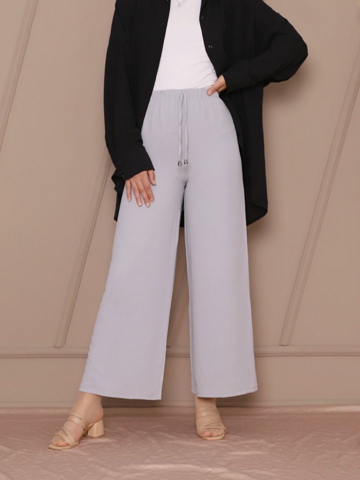 Bağcık Detaylı Bol Paça Beli Lastikli Pantolon -Gri