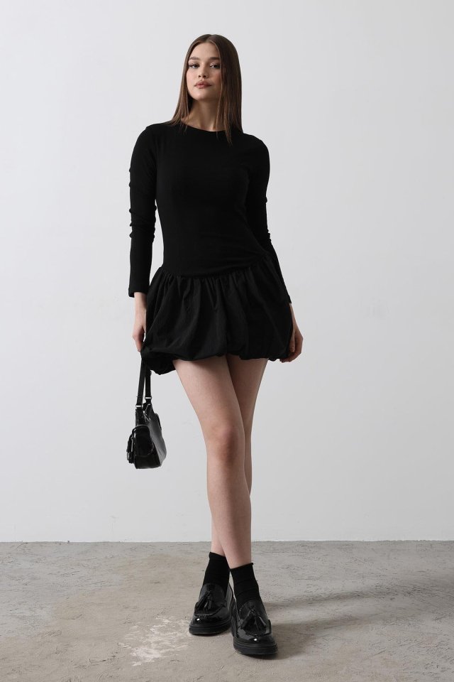 Balon Etekli Elbise - Siyah