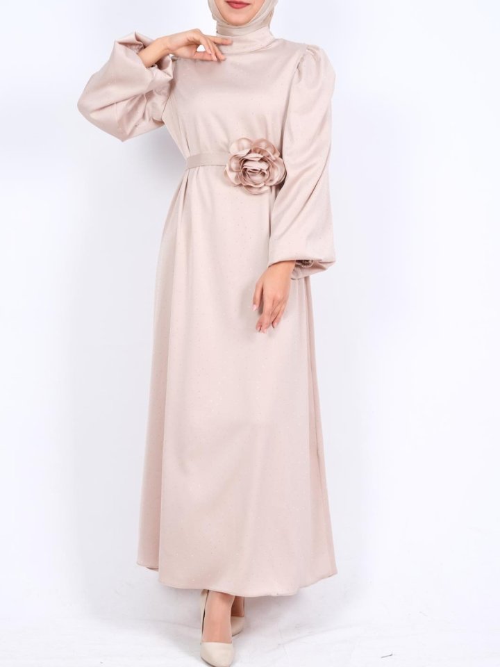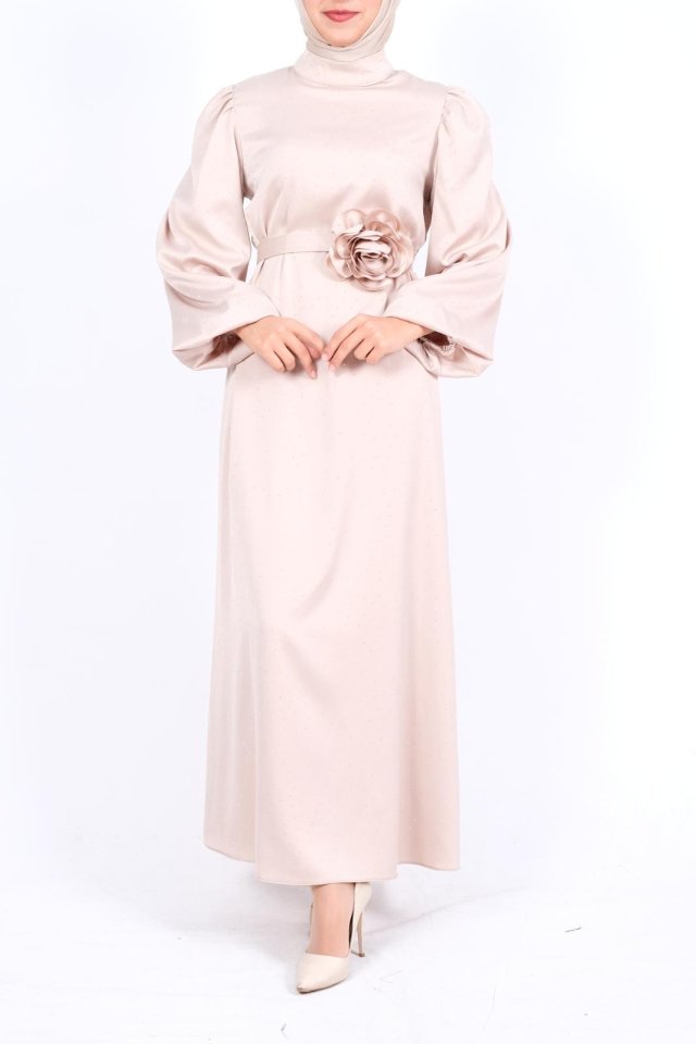 Balon Kol Kemerli Taşlı Saten Elbise -Bej