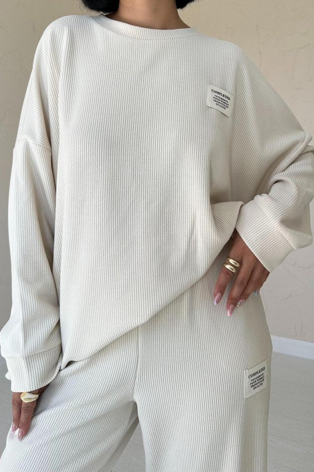 Bej Klasik Fitilli Kazak Ve Pantolon Takım
