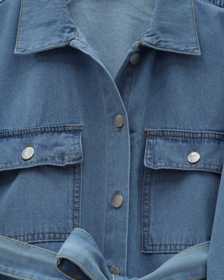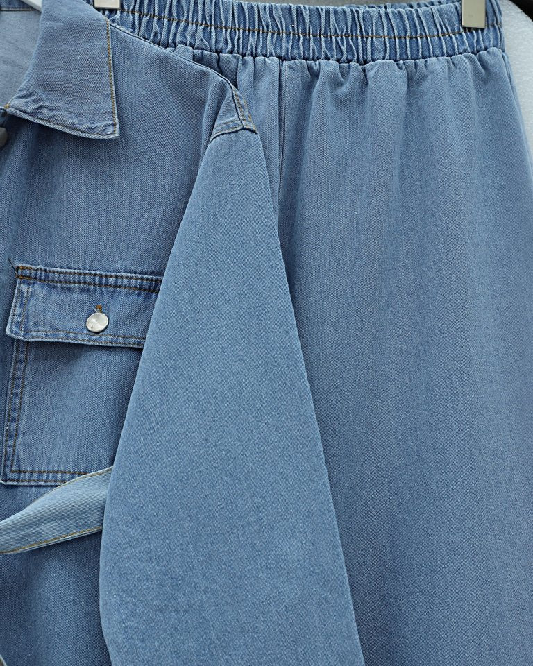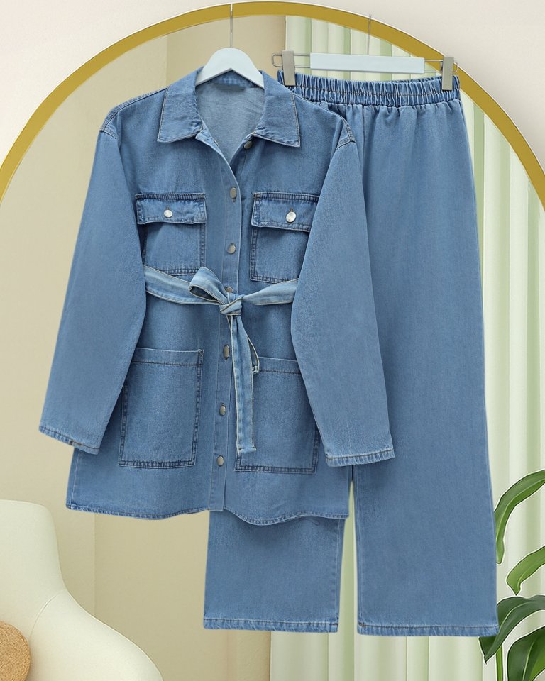 Beli Kemerli Cepli Önü Düğmeli Kot Takım -Buz Mavi