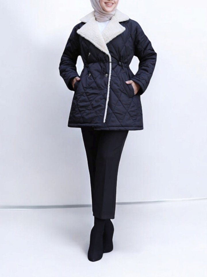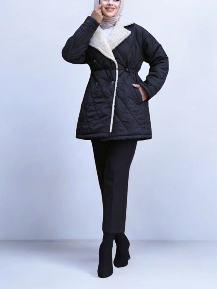 Beli Lastikli Peluş Detaylı Kapitone Mont -Siyah