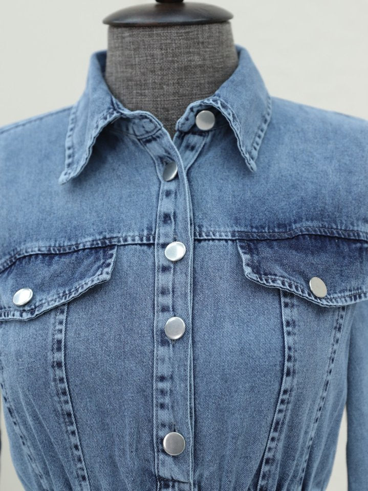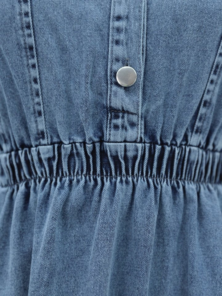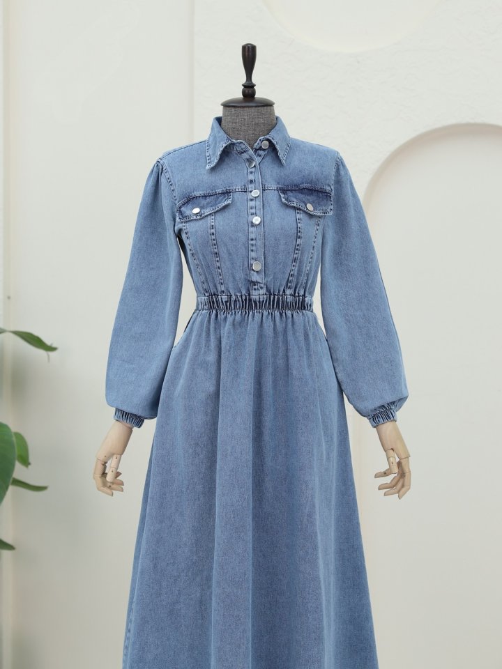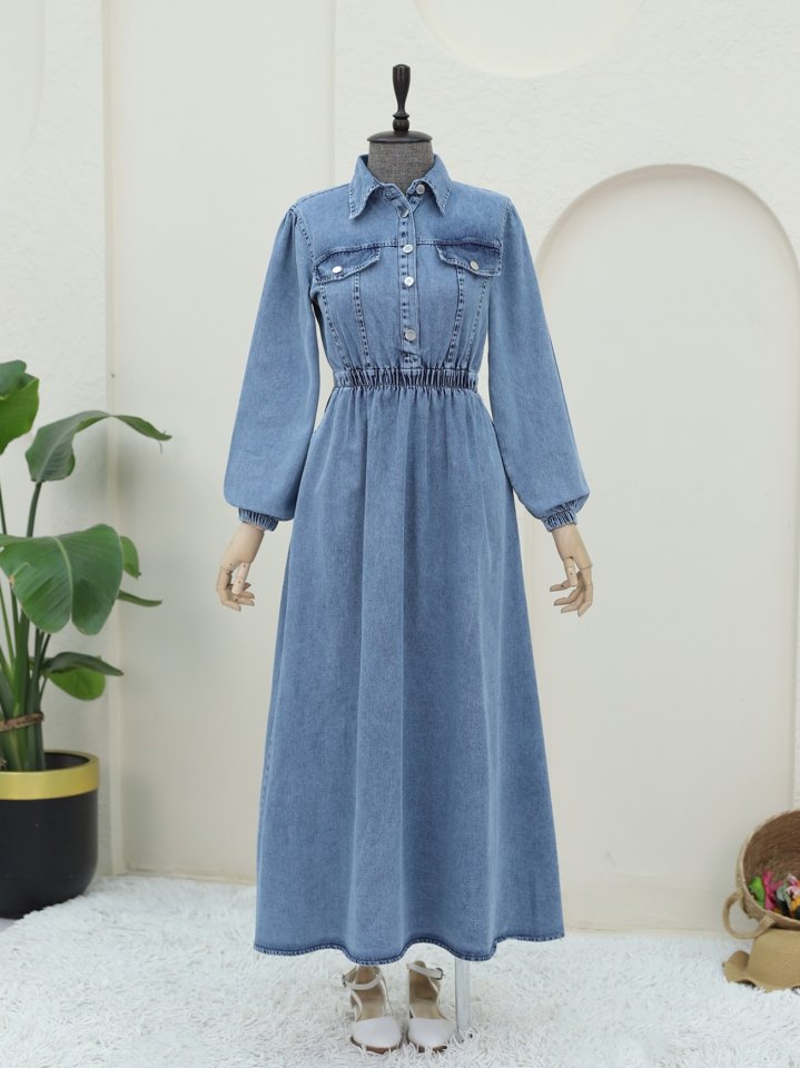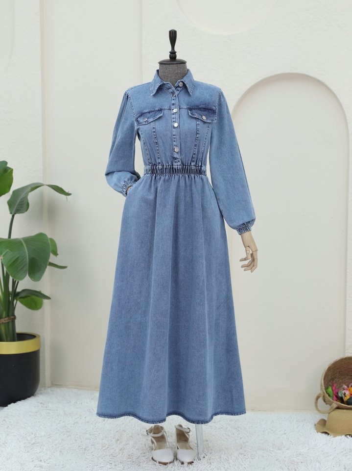 Beli Lastikli Yarım Düğmeli Kot Elbise -Buz Mavi