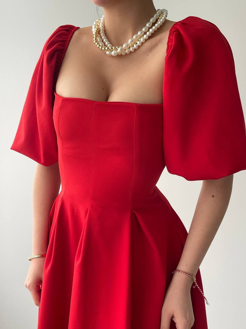 Kadın Kısa Kollu Yakası Açık Katlı Bürümcük Balon Elbise