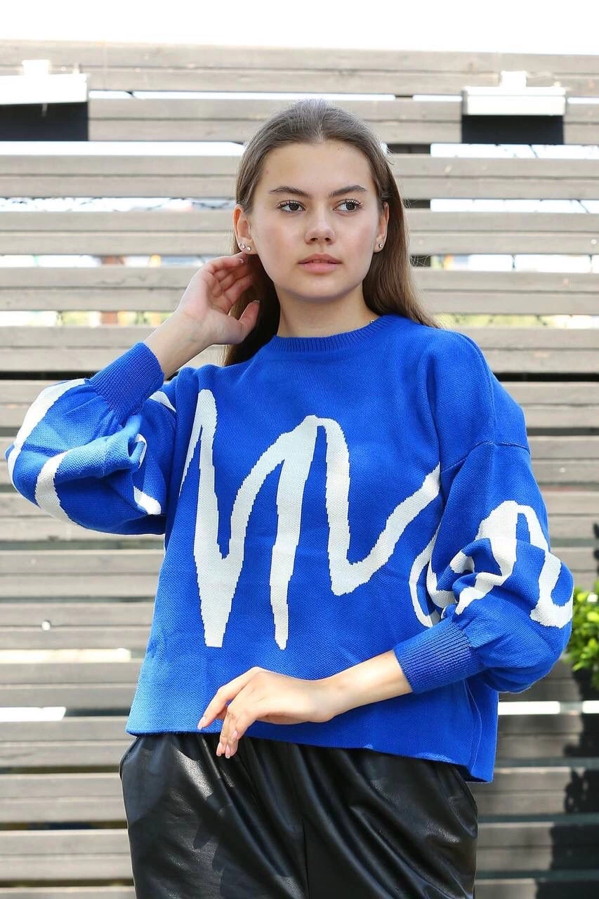Beyaz çizgili bisiklet yaka kazak saksmavisi