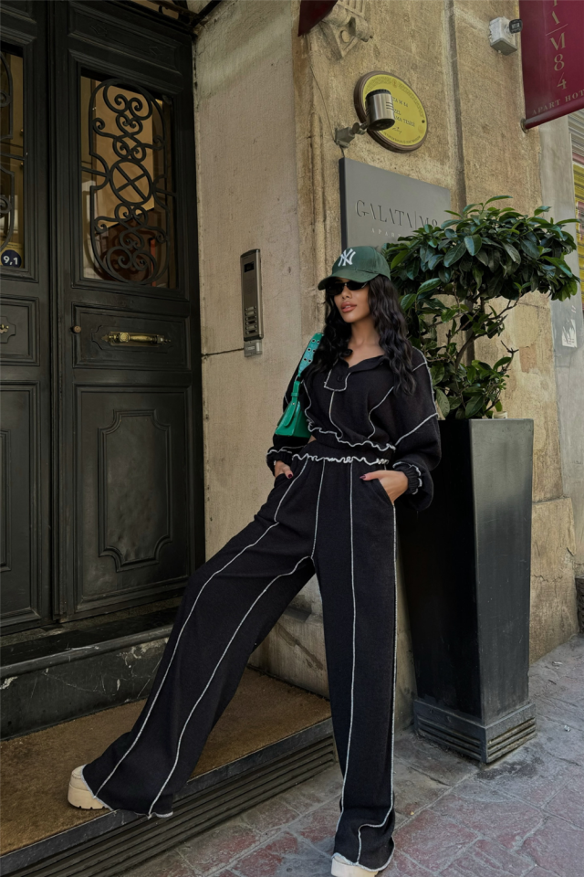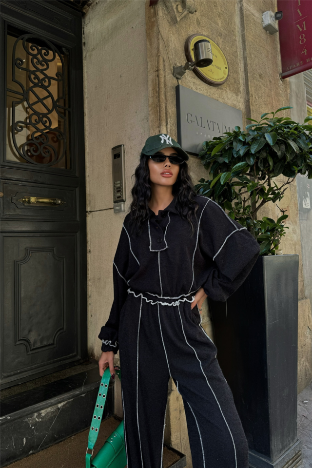 BİYELİ BLUZ PANTOLON TAKIM ŞÖNİL KUMAŞ - Siyah