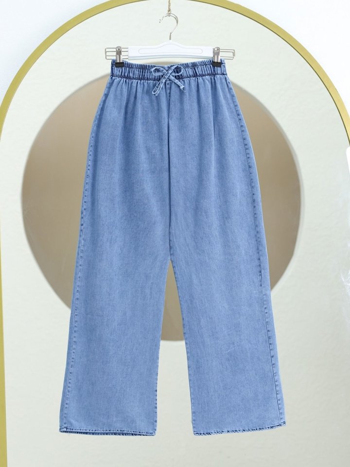 Bol Paça Beli Lastikli Bağcık Detaylı Kot Pantolon -Mavi