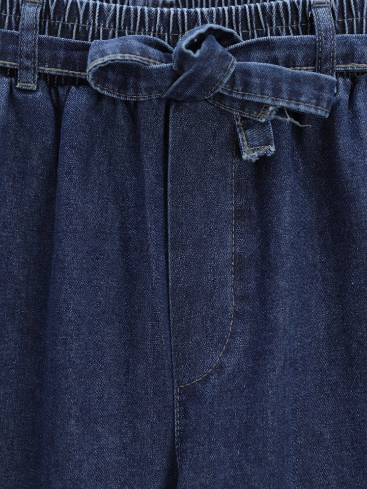 Bol Paça Beli Lastikli Kuşaklı Kot Pantolon -İndigo