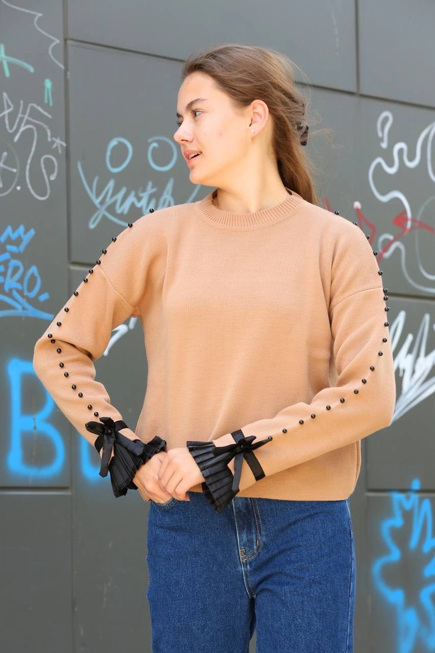 Kadın Uzun Kollu Kruvaze Yakalı Incili şardonlu Kaşkorse Bluz
