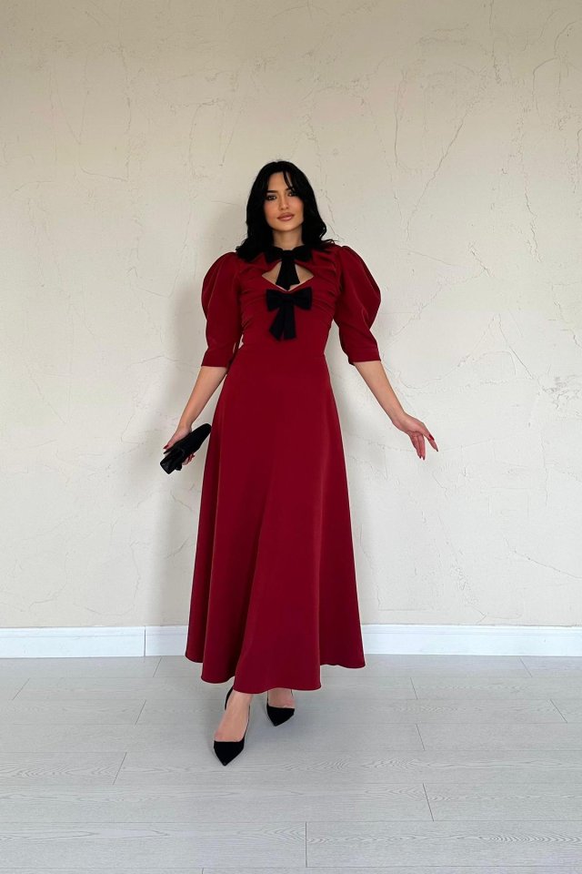Bordo Ön Dekolteli Fiyonk Garnili Uzun Elbise