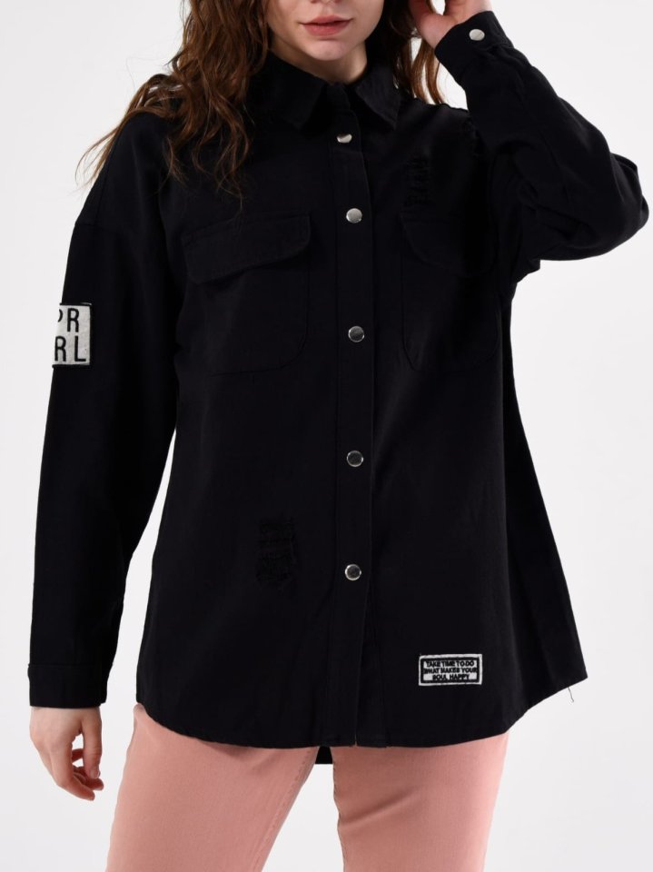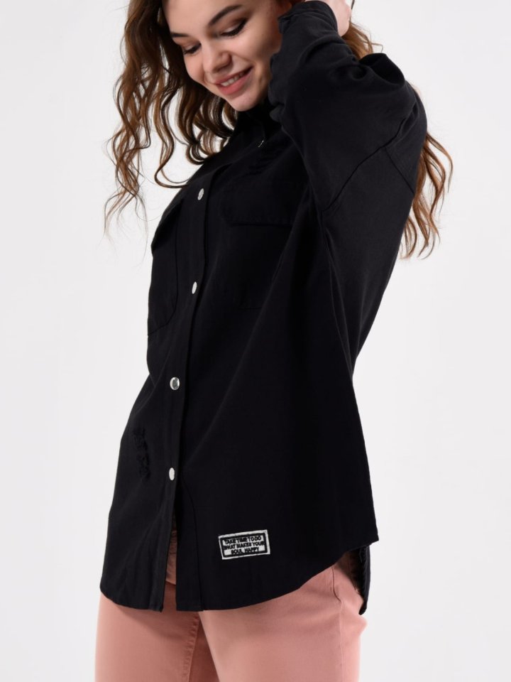 Boydan Çıtçıtlı Çift Cepli Yıpratma Detaylı Kot Ceket -Siyah