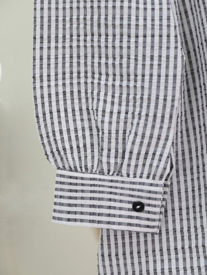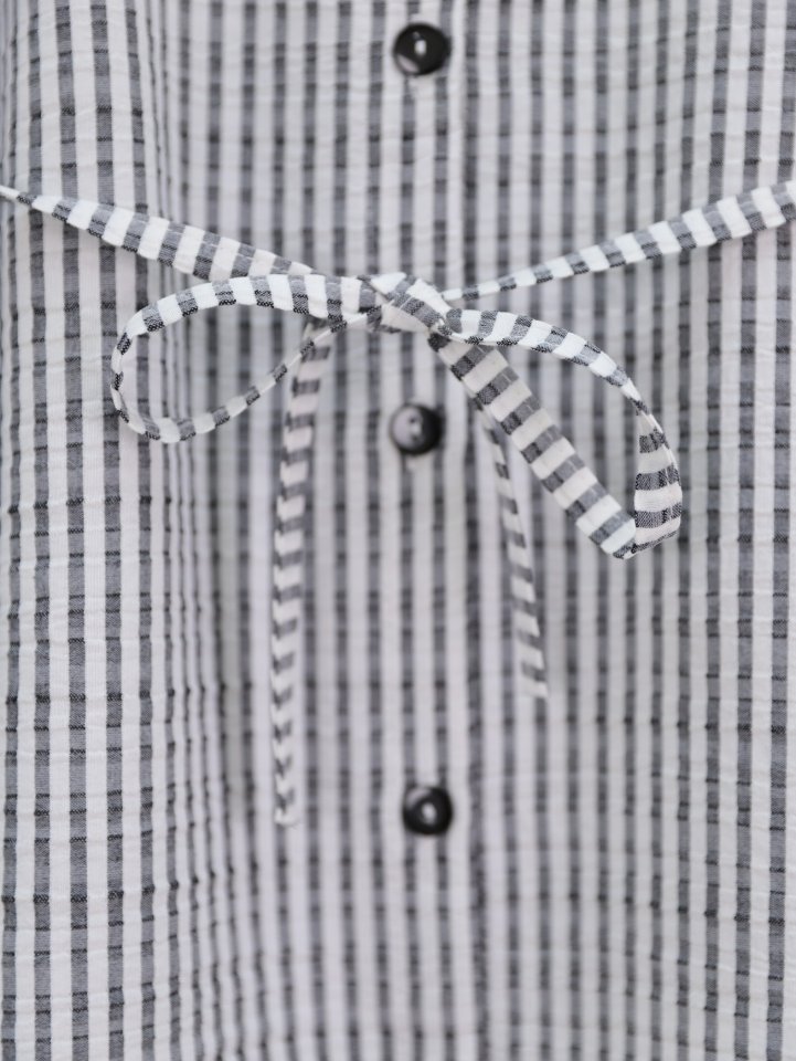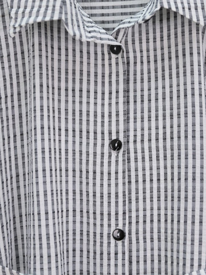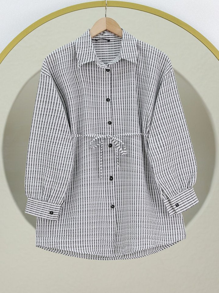 Boydan Düğmeli Bağcıklı Çizgili Bürümcük Gömlek -Gri