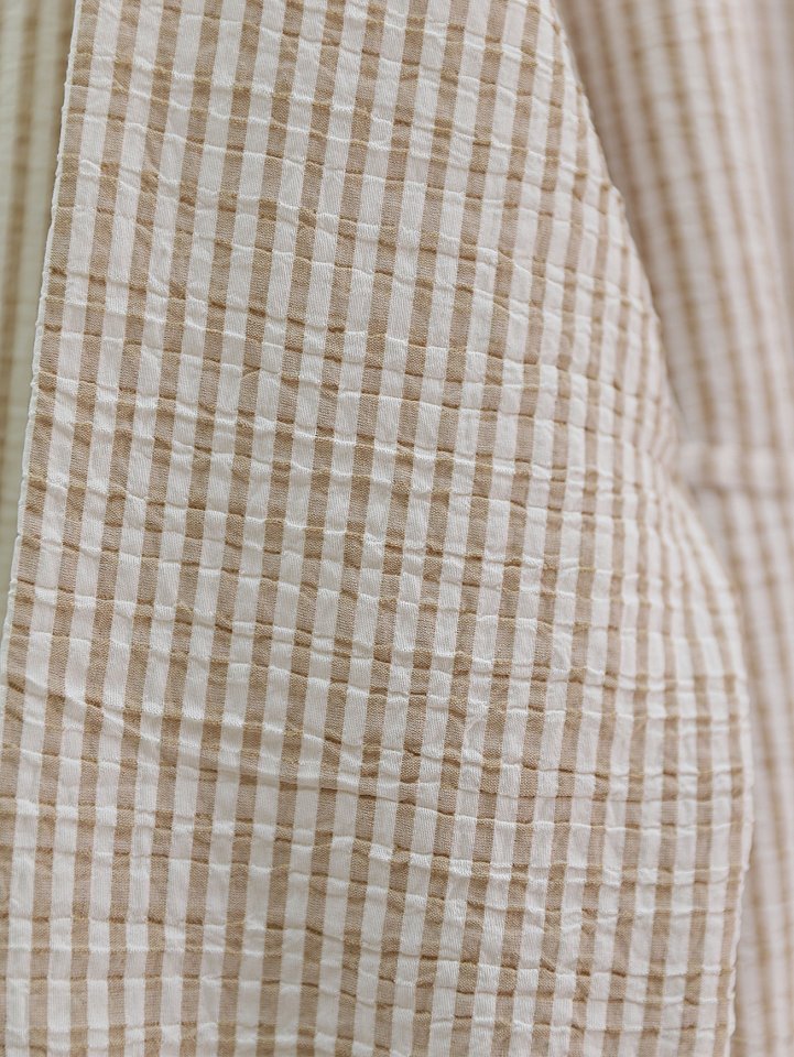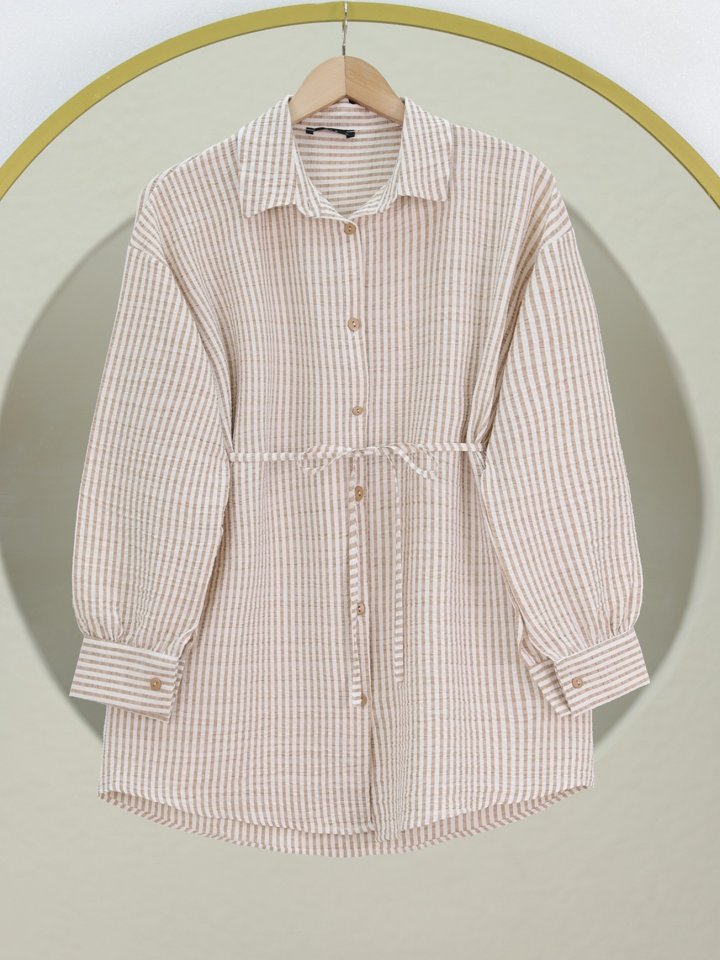 Boydan Düğmeli Bağcıklı Çizgili Bürümcük Gömlek -Vizon