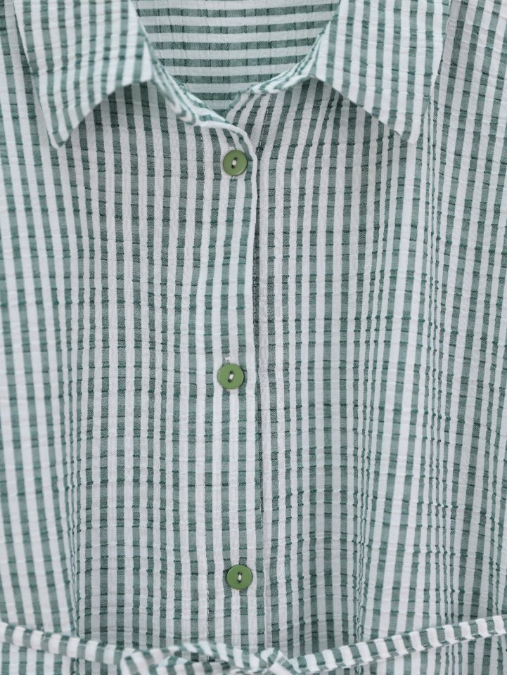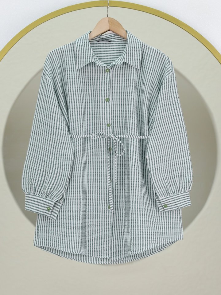 Boydan Düğmeli Bağcıklı Çizgili Bürümcük Gömlek -Yeşil