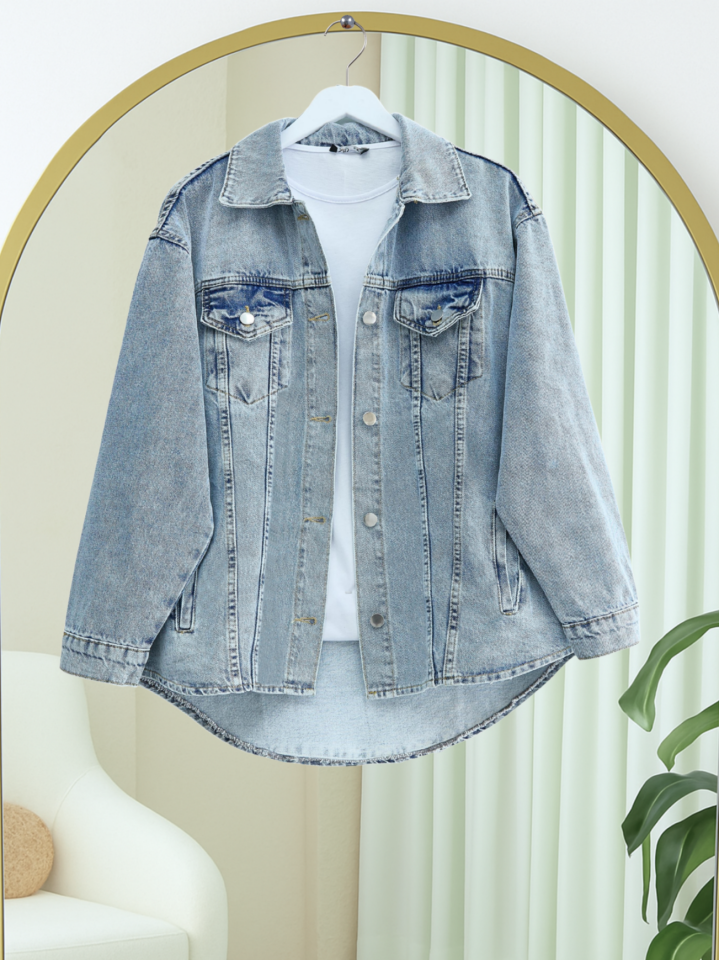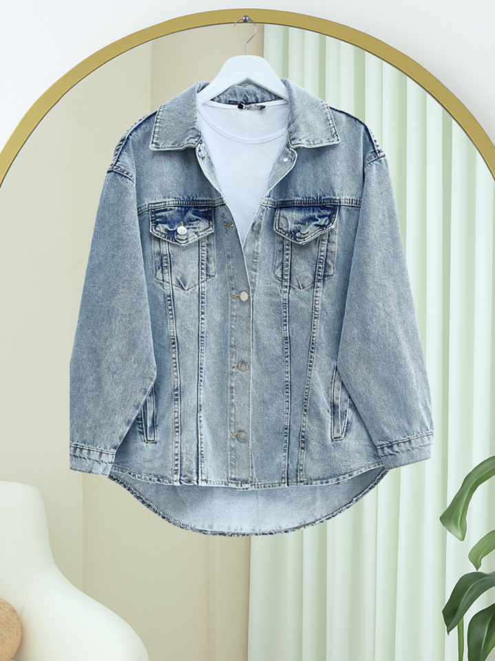 Boydan Düğmeli Cepli Kot Ceket -Buz Mavi