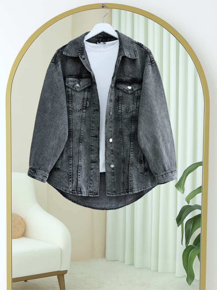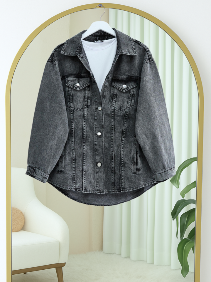 Boydan Düğmeli Cepli Kot Ceket -Füme
