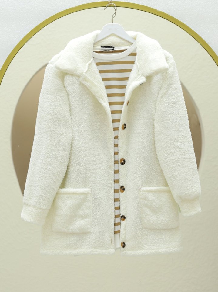Boydan Düğmeli Cepli Pelüş Ceket -Ekru