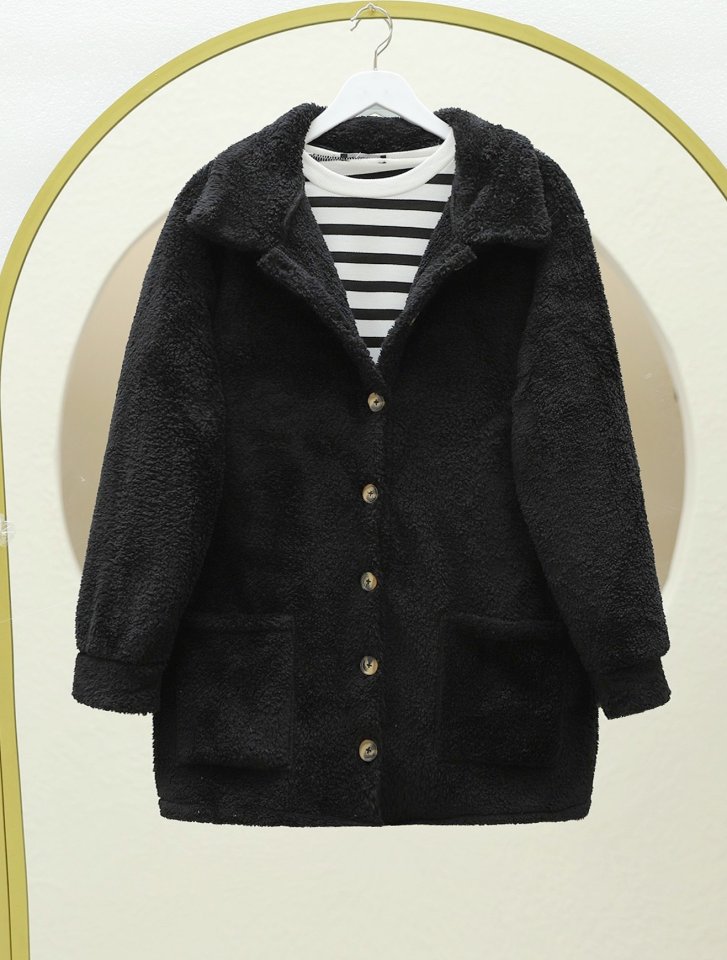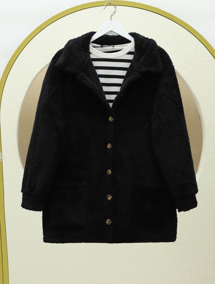 Boydan Düğmeli Cepli Pelüş Ceket -Siyah