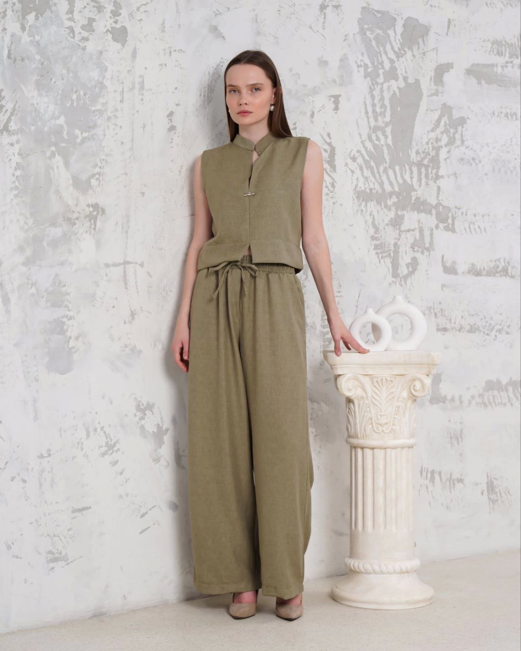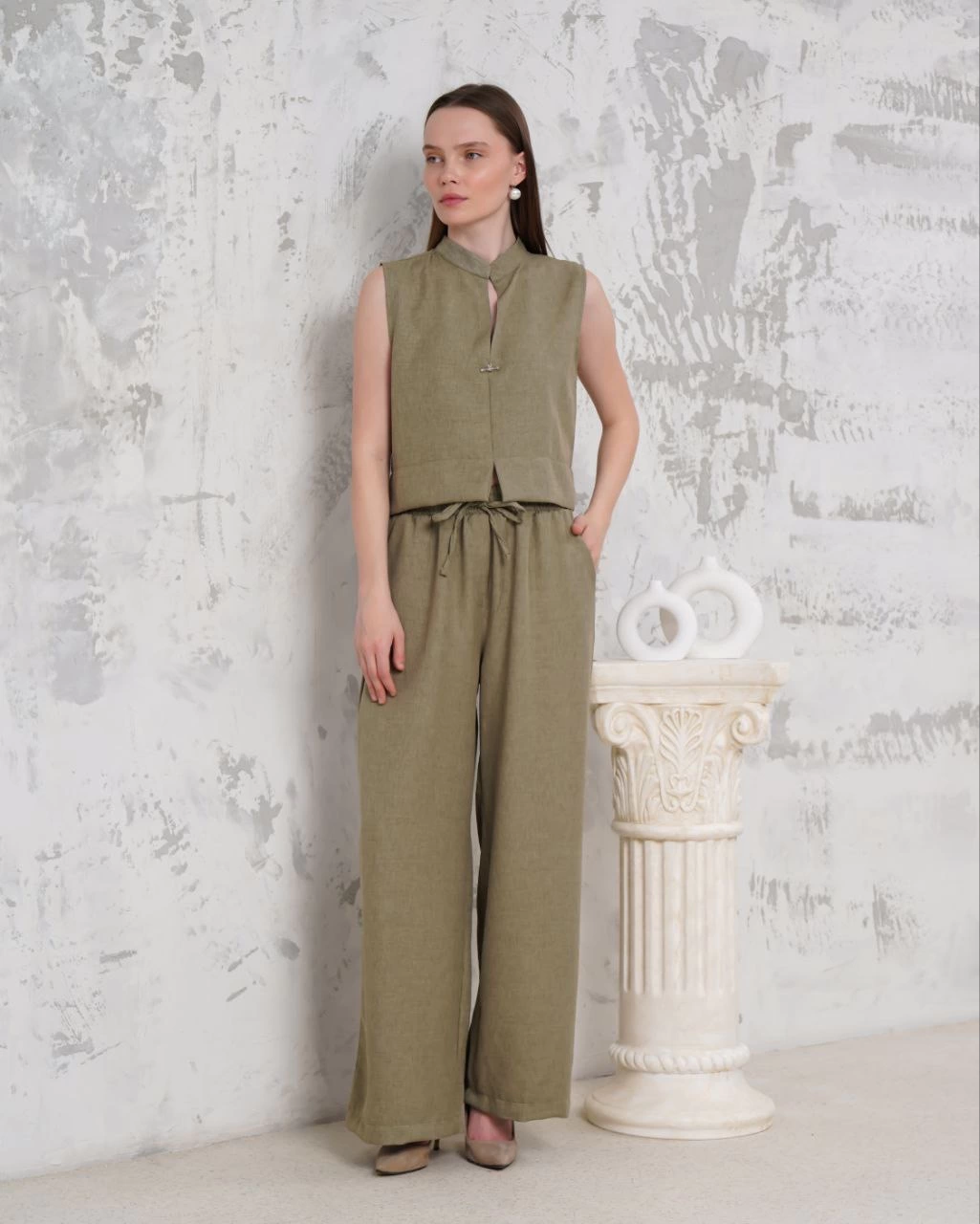Broşlu yelek pantolon takım haki s255821