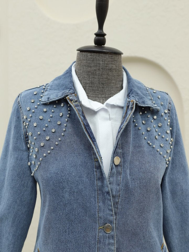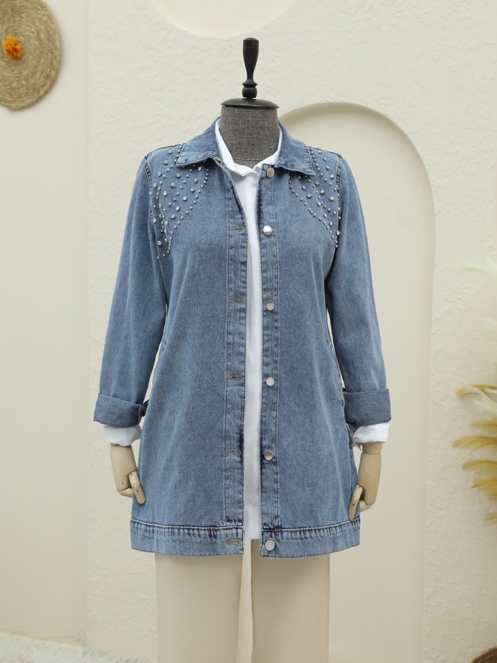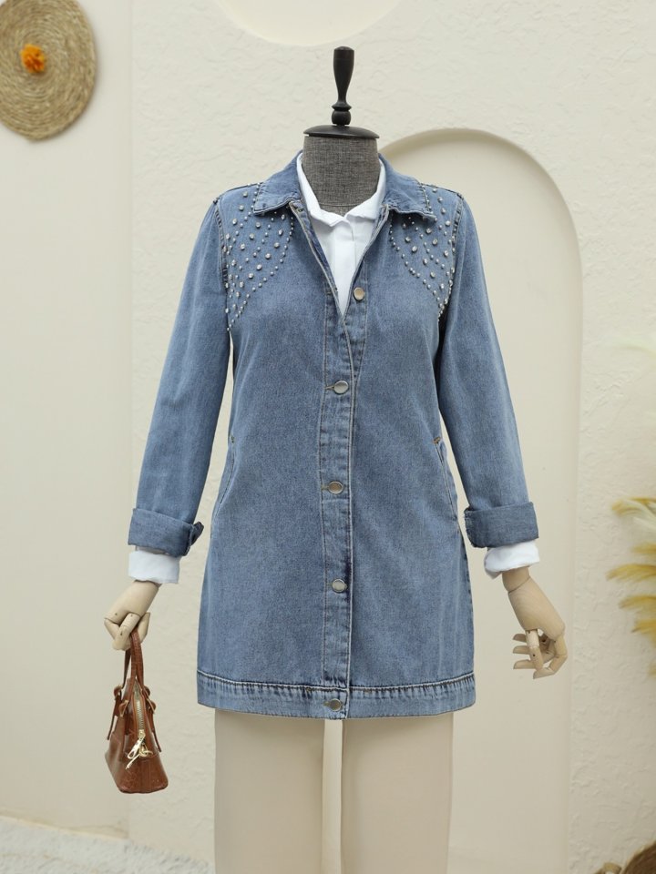 Büyük Taş Detaylı Düğmeli Cepli Kot Ceket -Buz Mavi