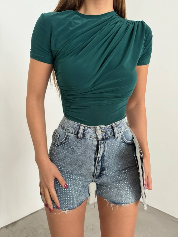 Çapraz Büzgülü Kısa Kol Sandy Bluz -Zümrüt