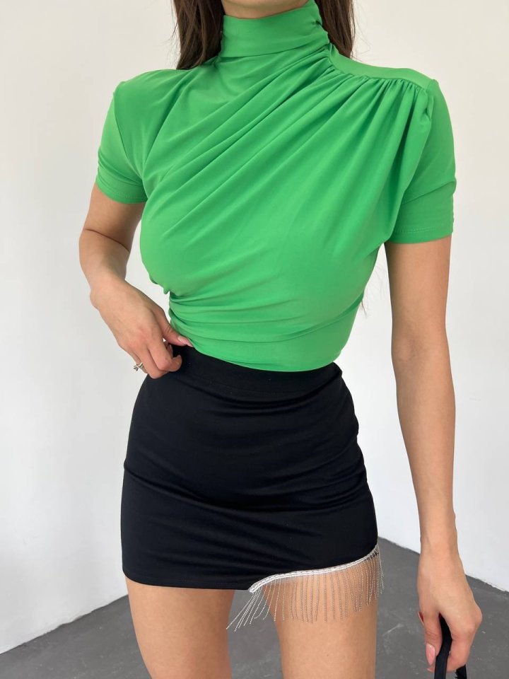 Çapraz Büzgülü Yarım Boğazlı Sandy Bluz -Yeşil