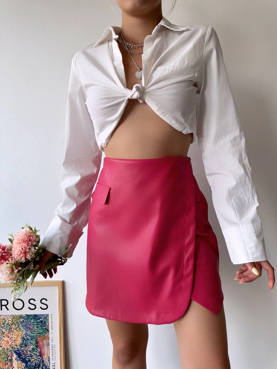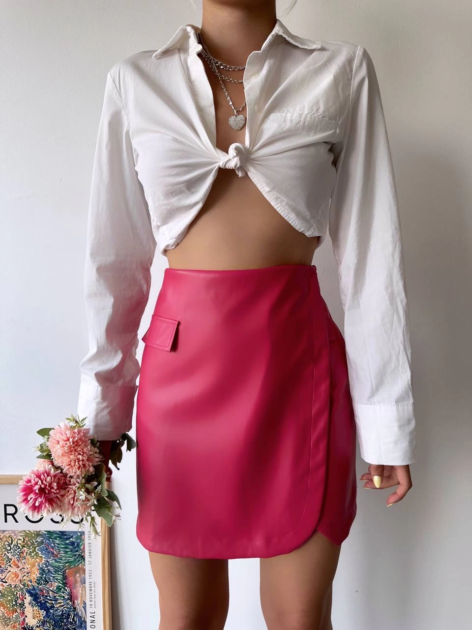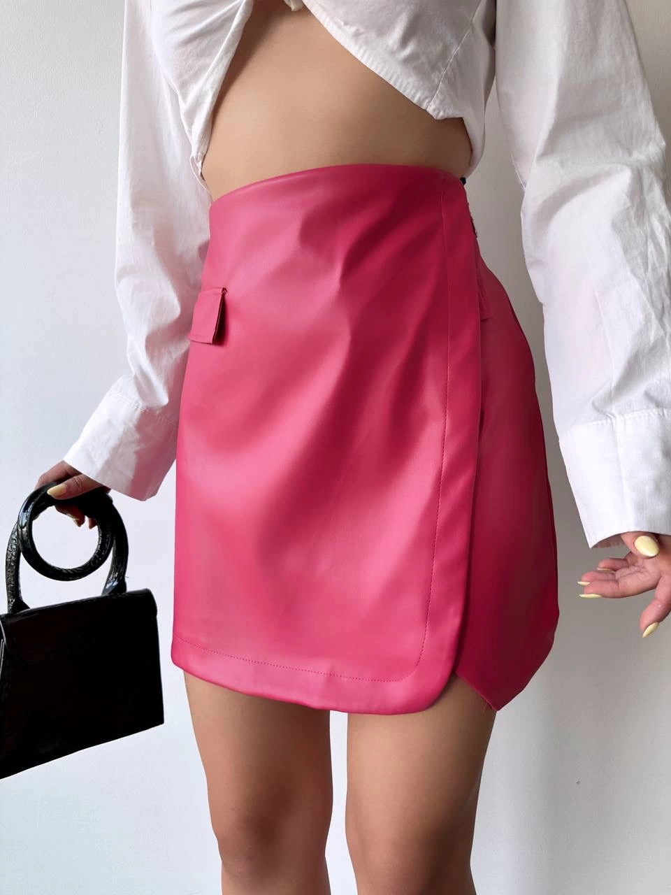 Cep detaylı oval kapaklı deri etek fuşya h240048