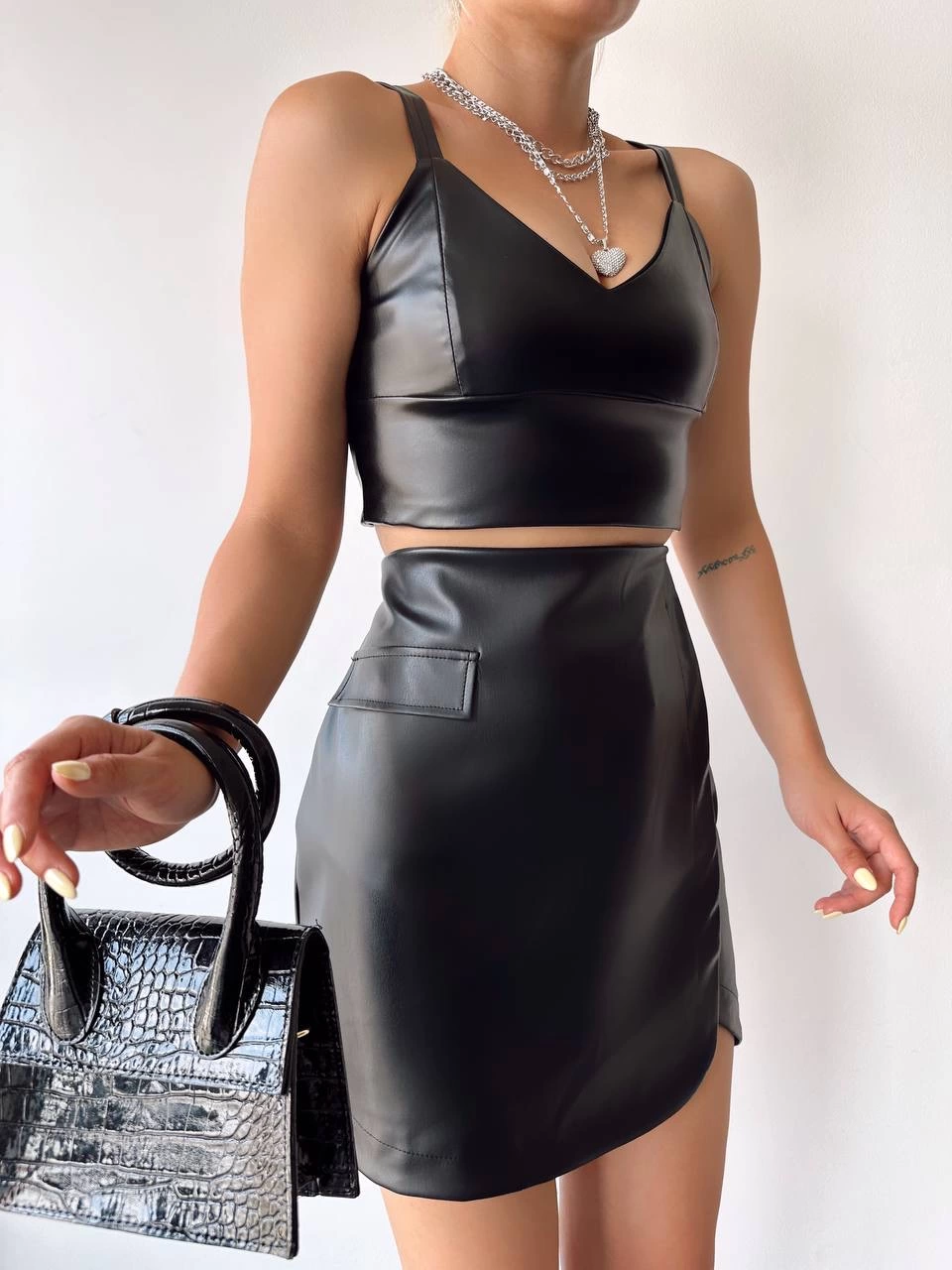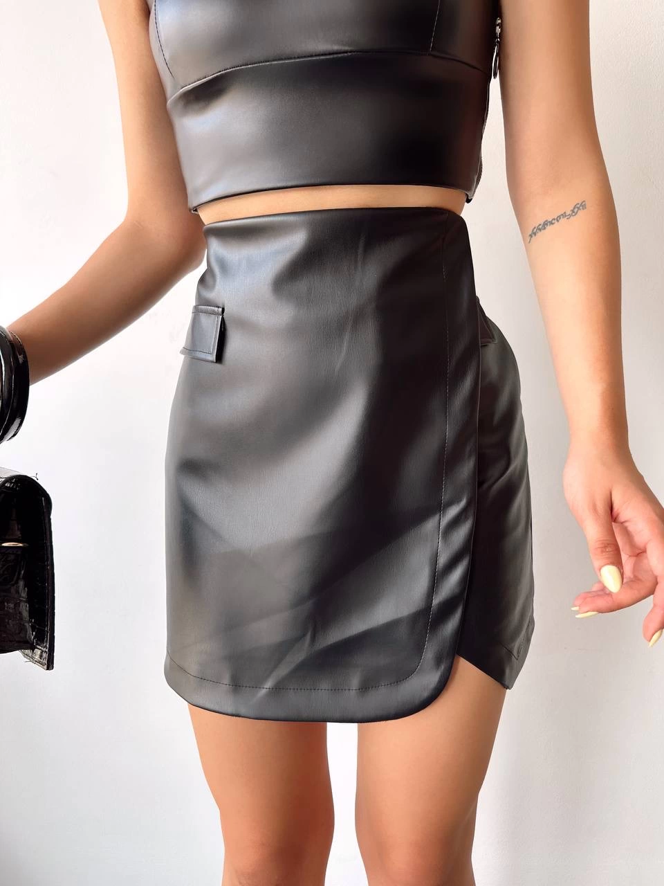 Cep detaylı oval kapaklı deri etek siyah h240048