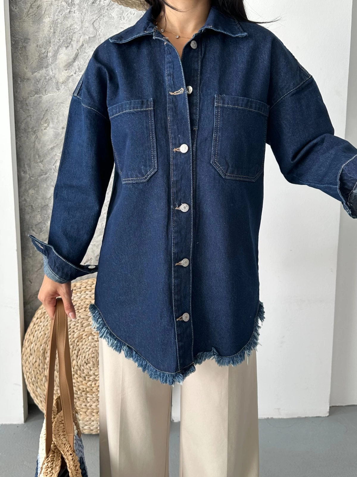 Cepli püsküllü kar yıkama kot ceket koyu mavi d2515