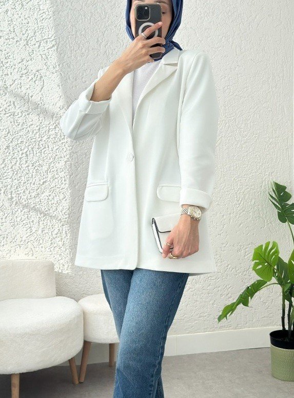 Cepli Tek Düğmeli Likralı Ceket -Beyaz