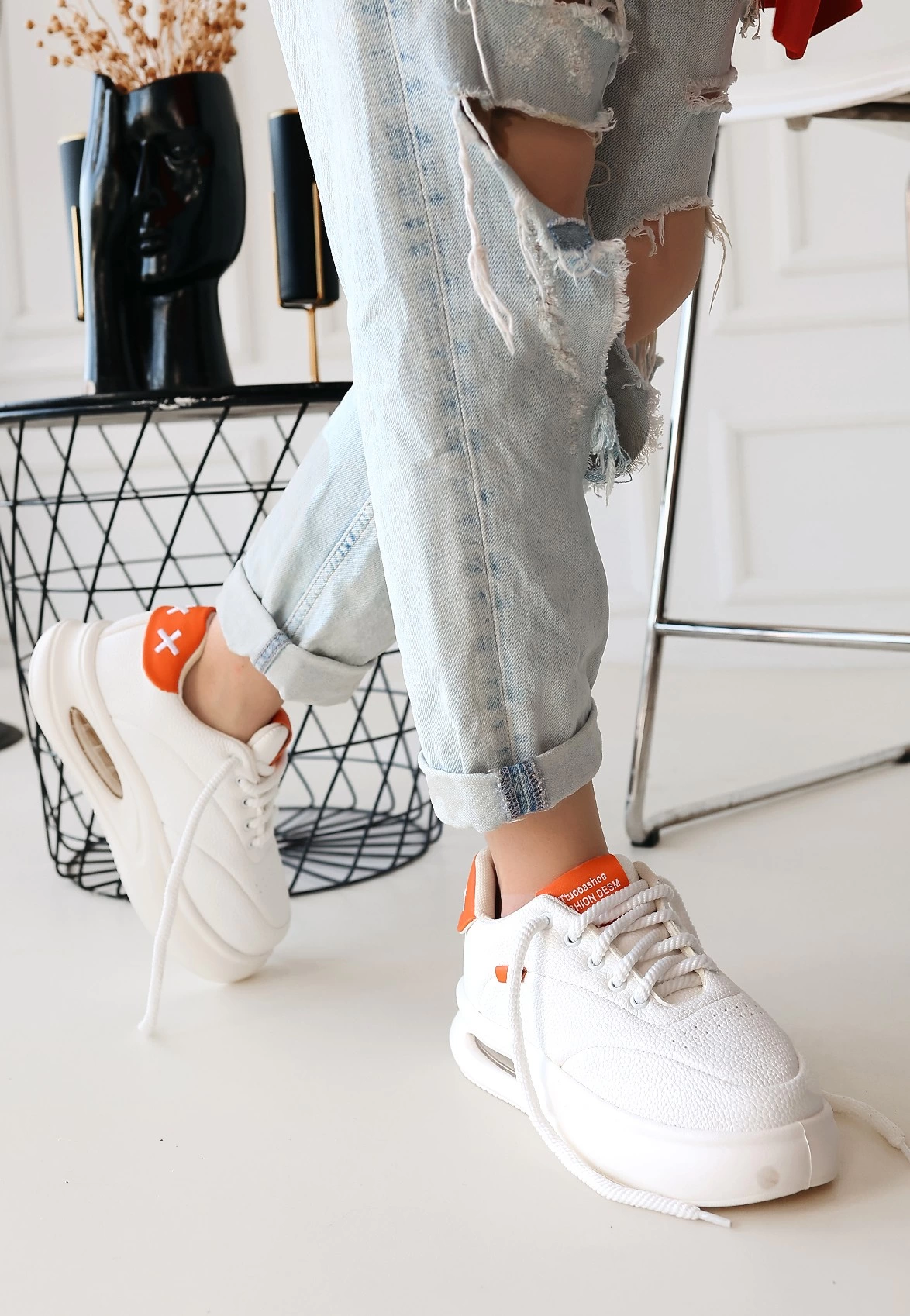 Chris Beyaz Cilt Turuncu Detaylı Bağcıklı Spor Ayakkabı