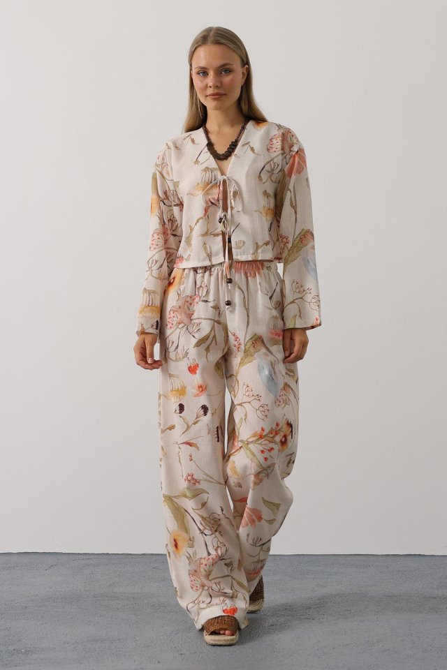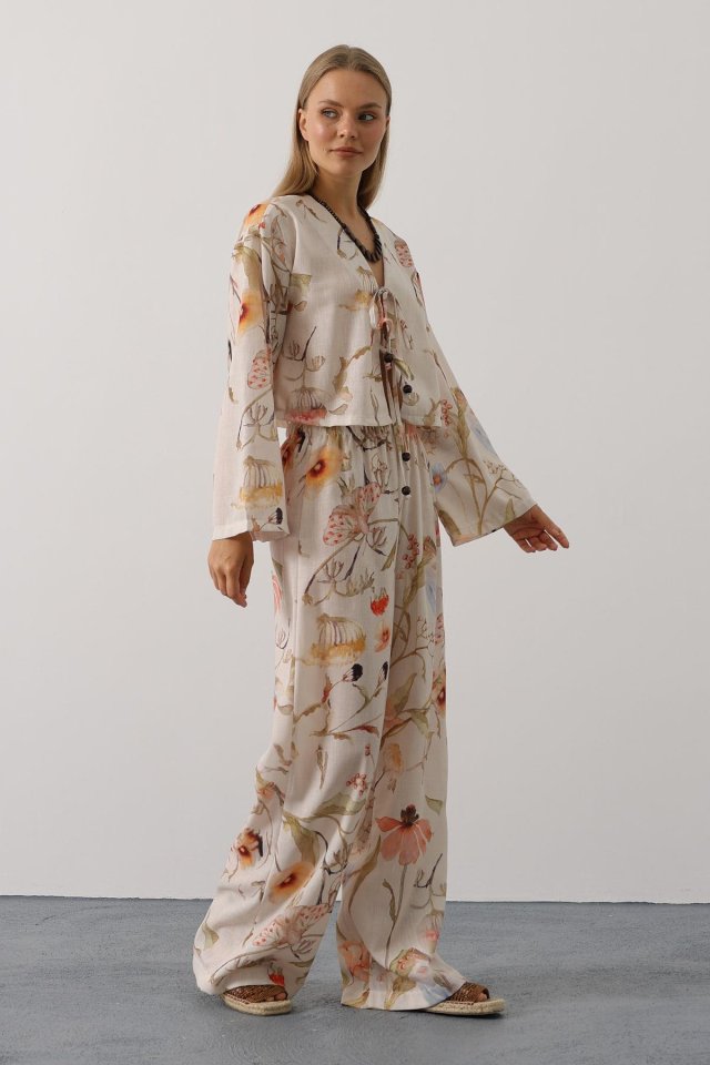 Çiçek Desen Önü Bağlamalı Pantolon Takım - Taş