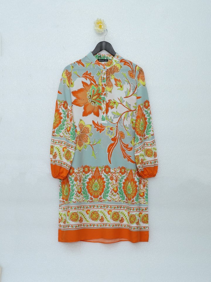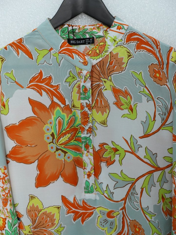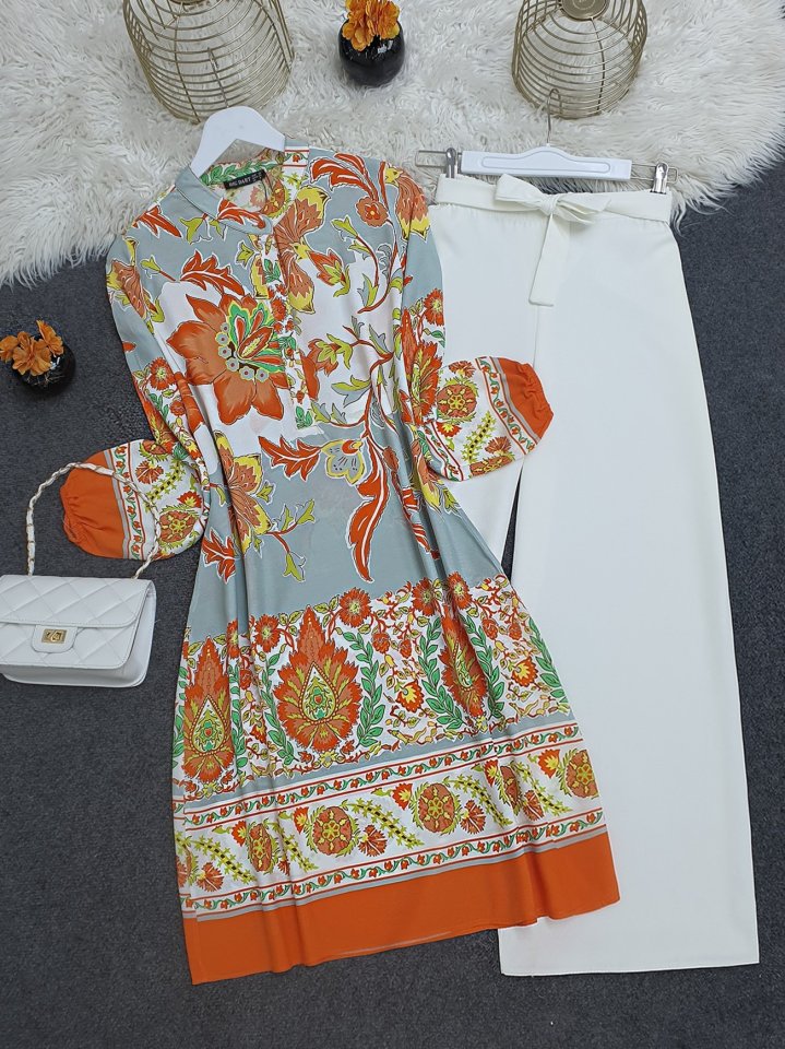 Çiçek Desenli Yarım Düğmeli Pamuk Viskon Tunik -Turuncu
