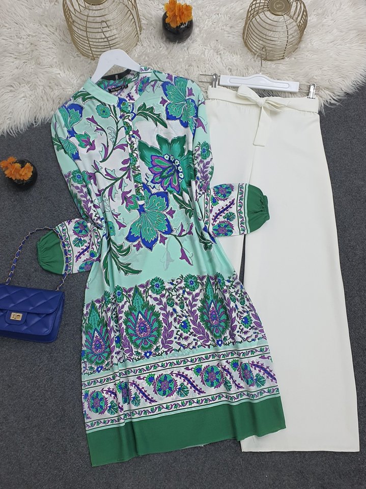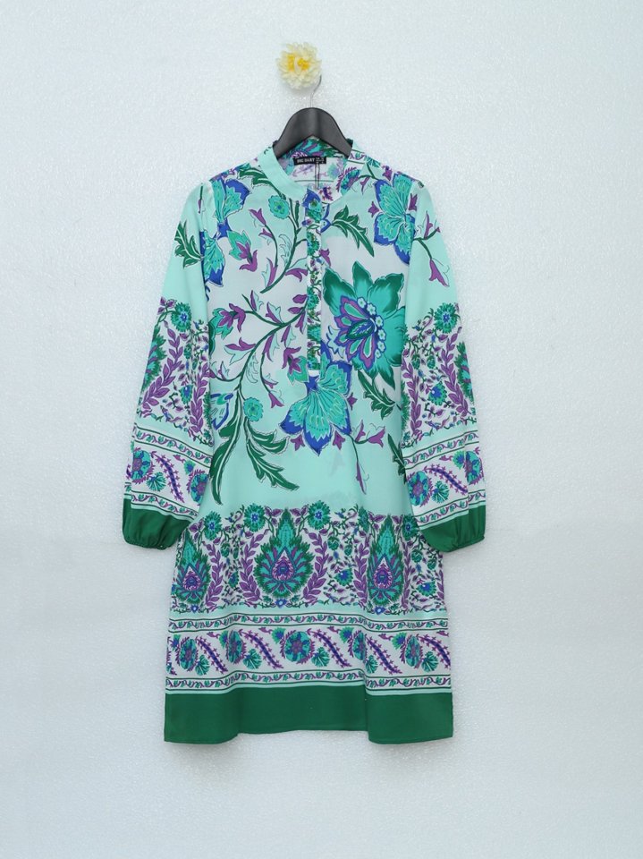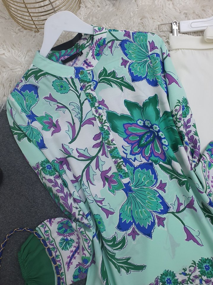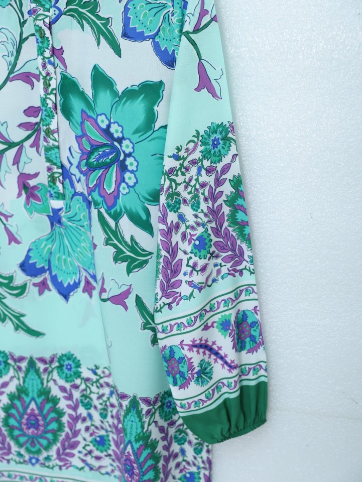 Çiçek Desenli Yarım Düğmeli Pamuk Viskon Tunik -Yeşil